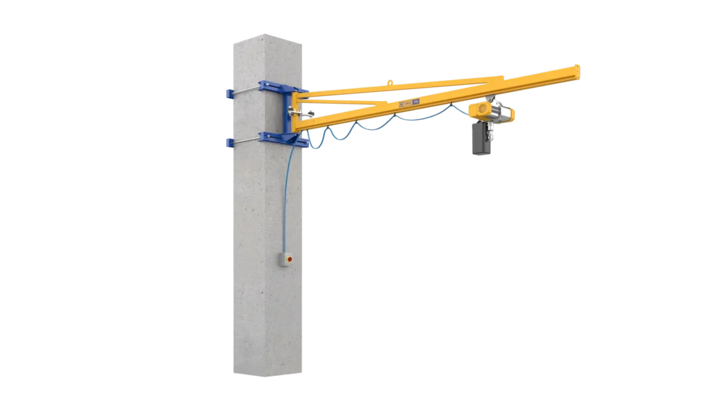 Wall mounted jib cranes are fixed directly to building columns or walls. They help save valuable floor space and are commonly used in warehouses and production lines with limited space availability.